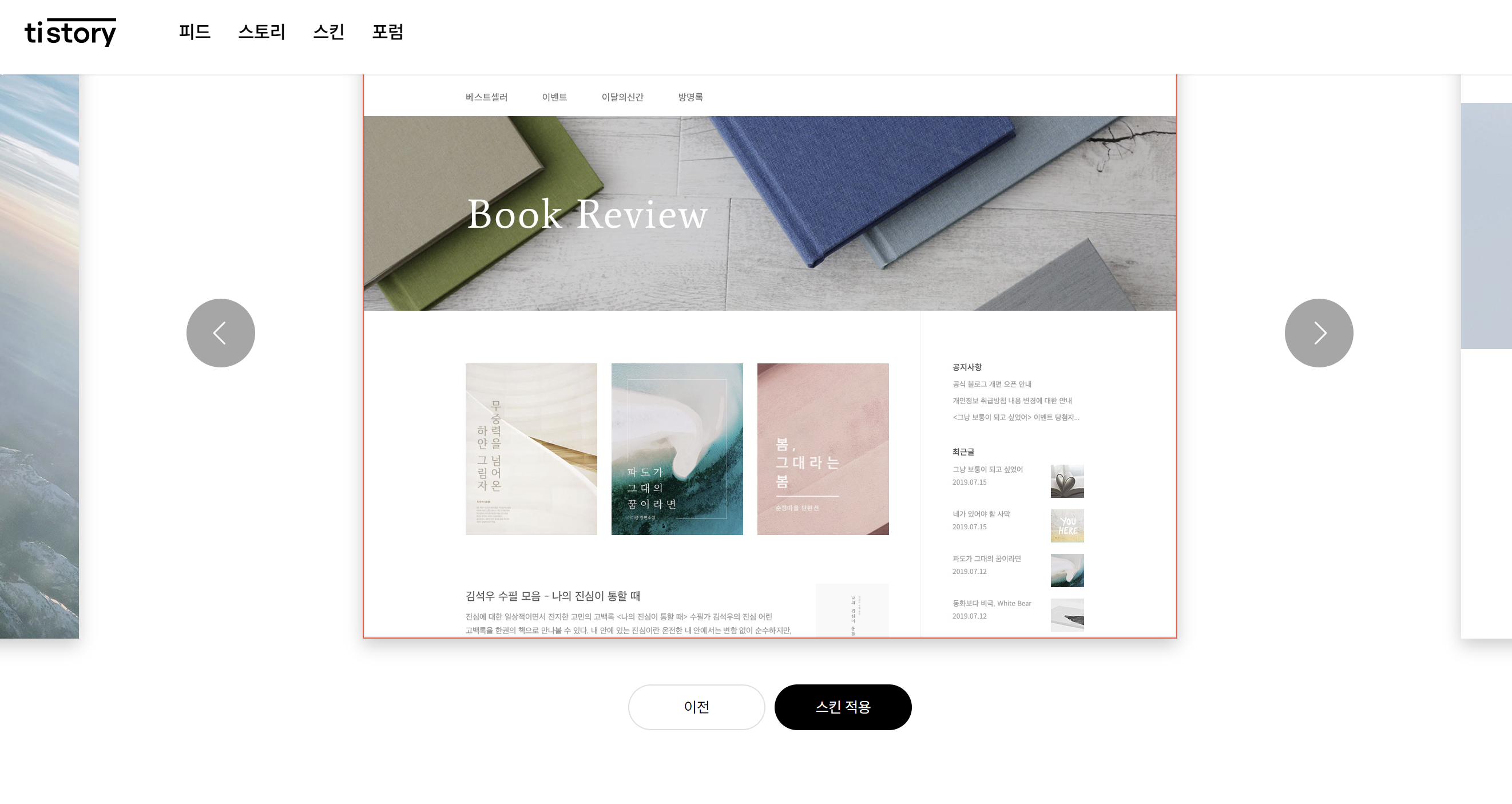 - 스킨선택은 아무거나 하셔도 됩니다. 저는 BOOK Review를 선호하는 편입니다.